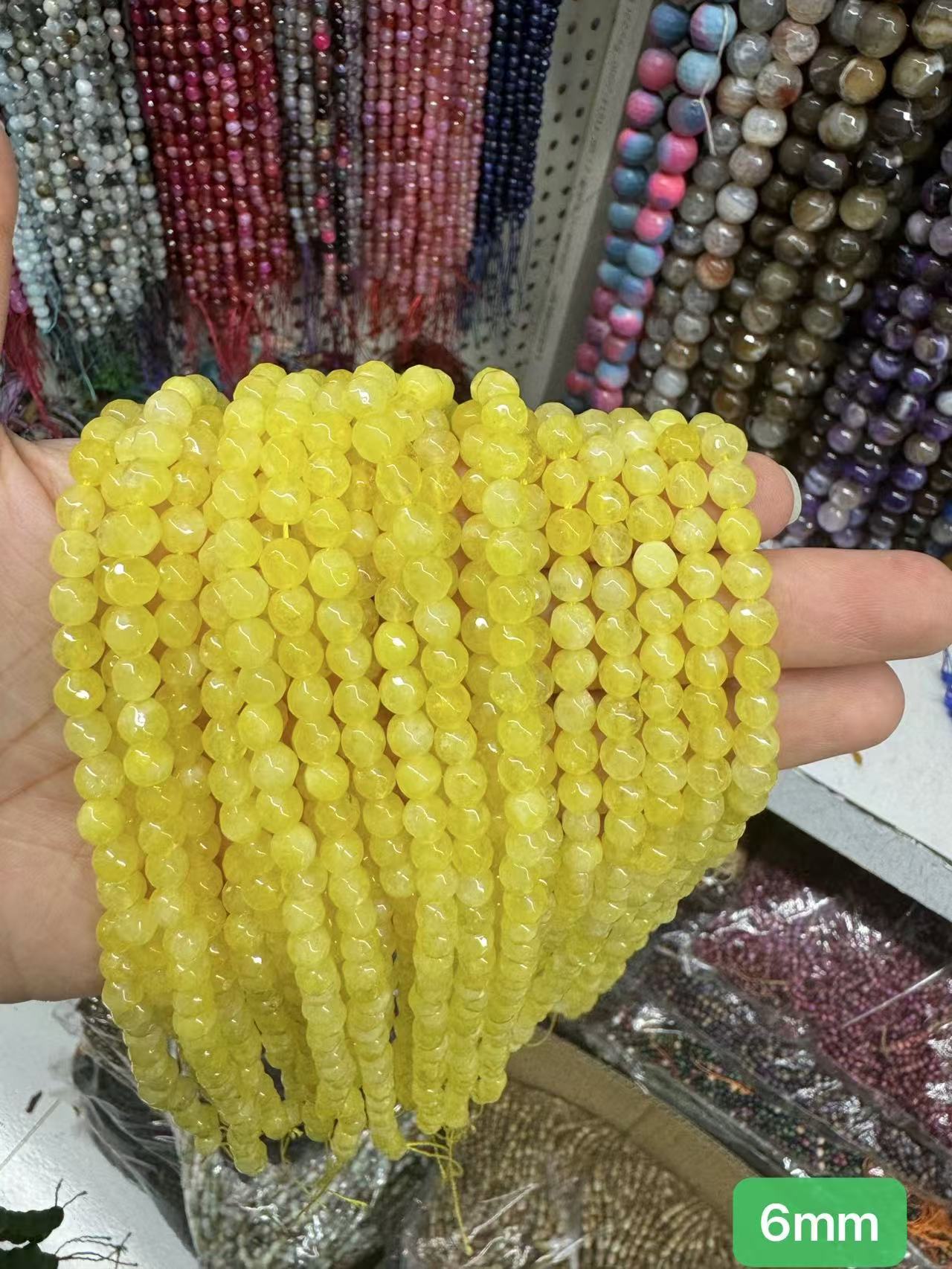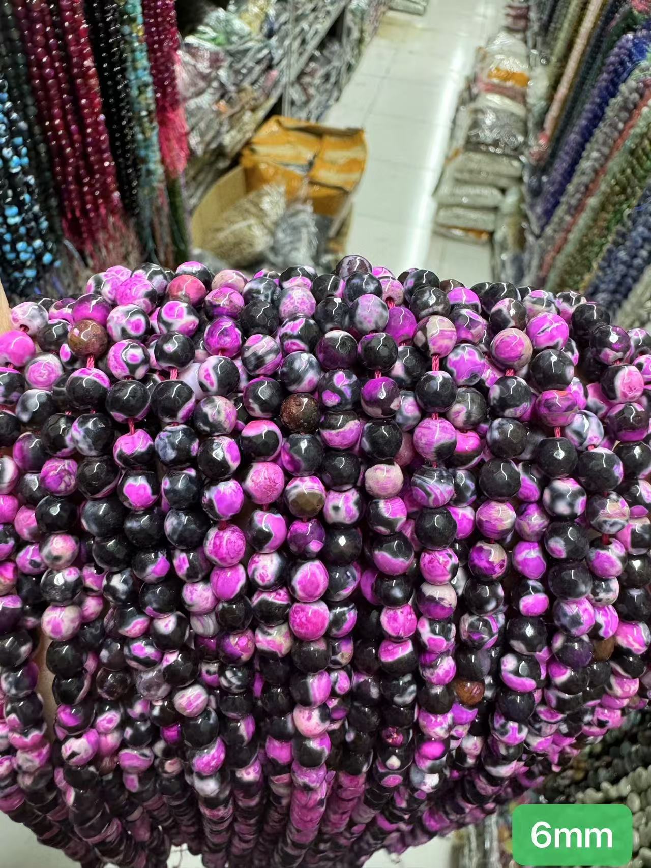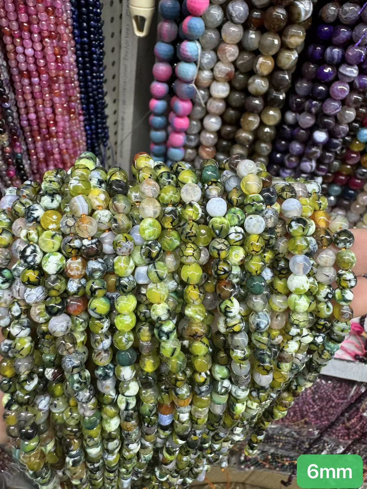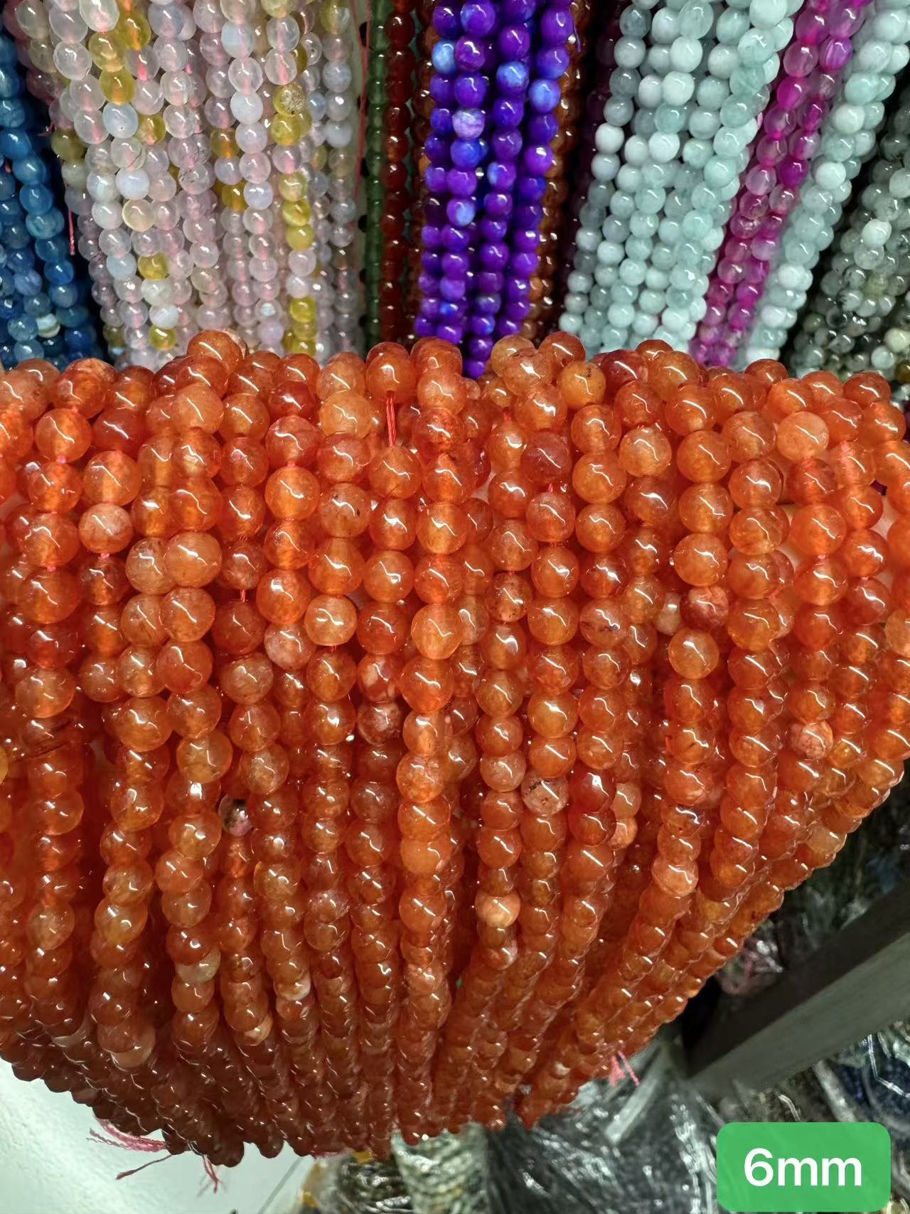 6mm about 0.8mm hole, about 60 beads per strand