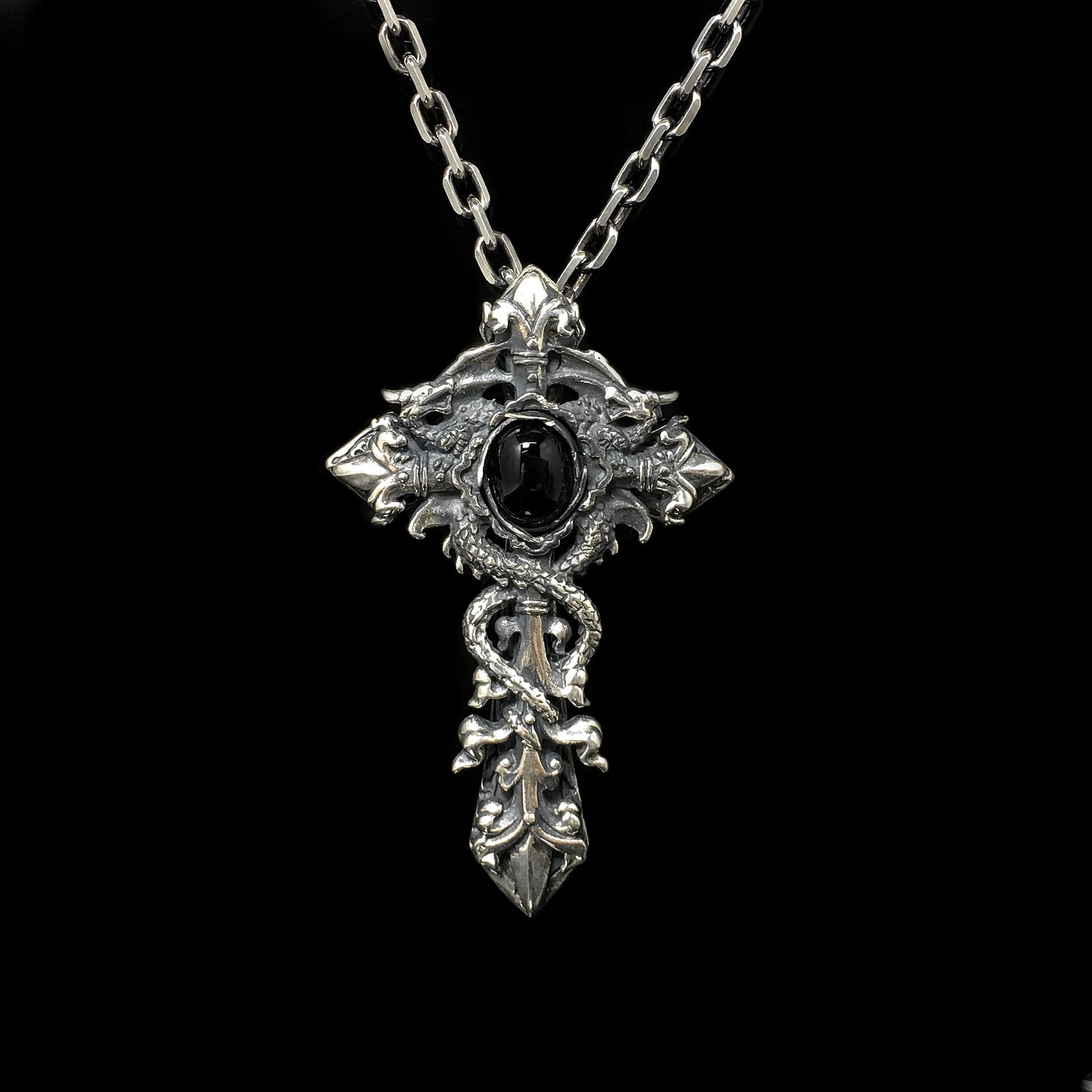 Antique Black Onyx Cross 925 Silver Pendant